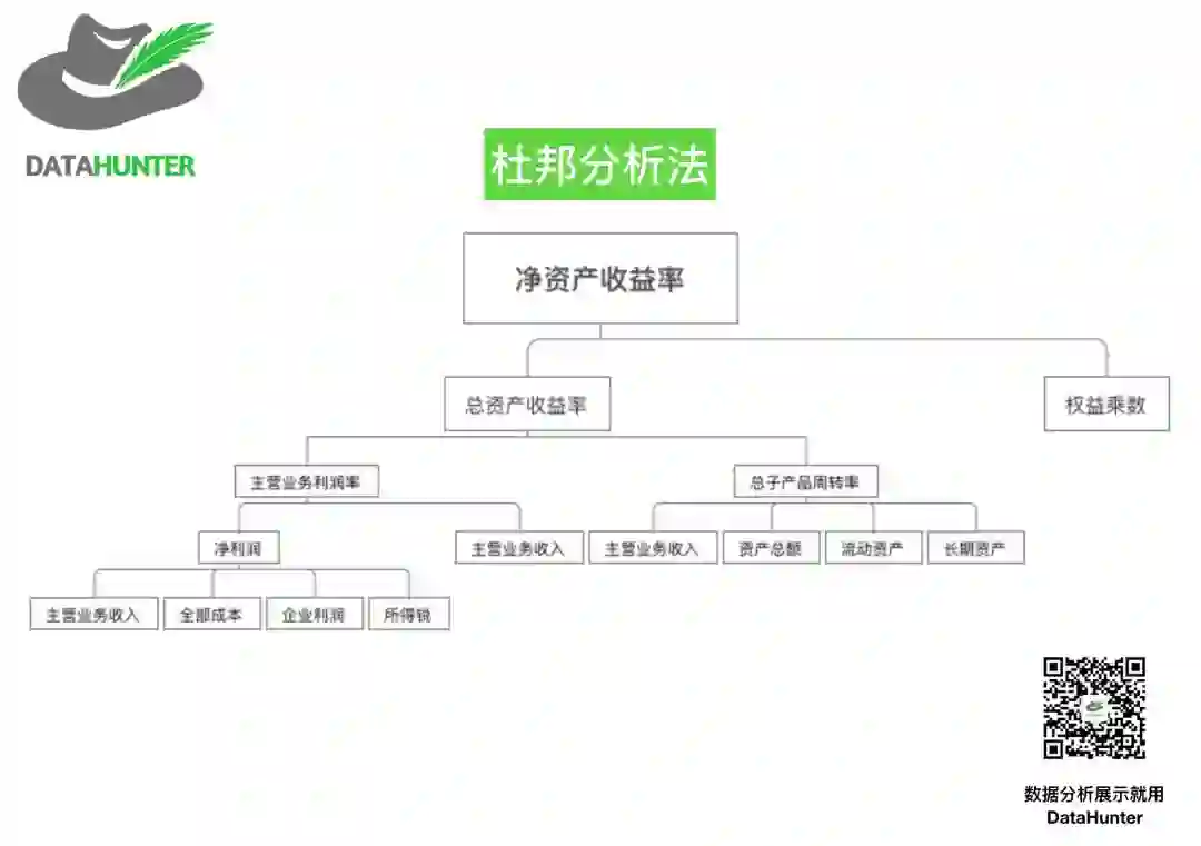 为先对异常指标进行拆解,确保指标拆到最细颗粒度的指标,如图所示的杜邦分析法,然后通过对比前后2个时间段上最细颗粒度指标的变化,评估哪一个指标的波动对这个指标的波动贡献度最大。