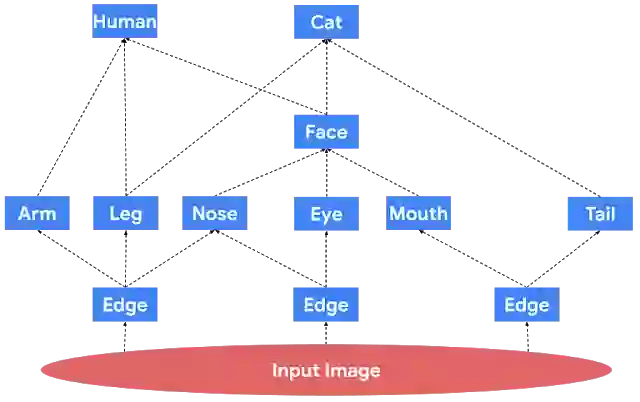 上图展示了图像处理的模块化网络。数据通过蓝色方框所表示的模块从底部传输到顶部。请注意,底层的模块对应于基础对象,如图像中的边缘,而上层的模块对应于较复杂的对象,如人类或猫。另外,在这个假设的模块化网络中,面部模块的输出是通用的,可用于人类和猫模块