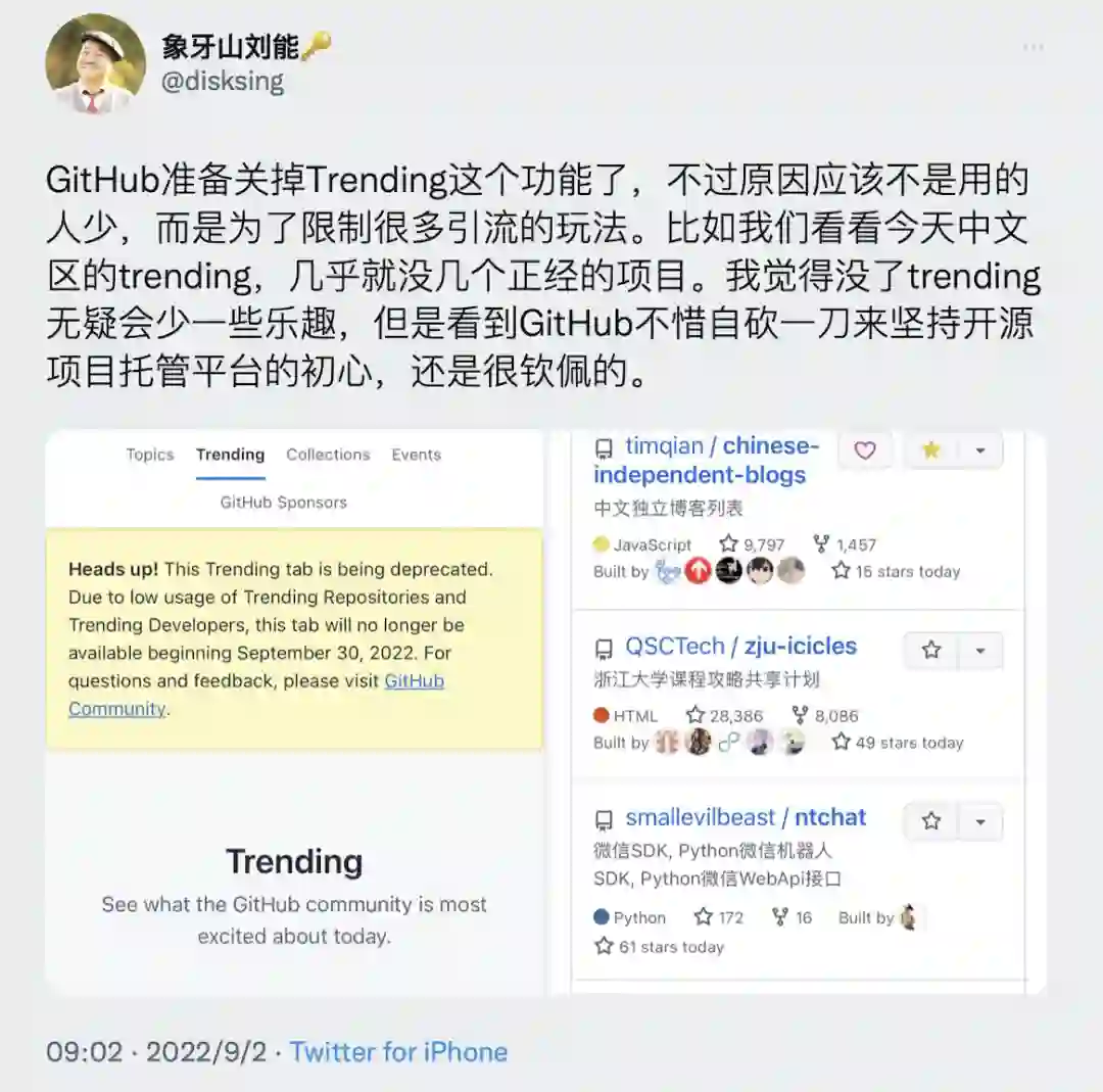 Twitter 用户@象牙山刘能表示,「GitHub 准备关掉 Trending 这个功能了,不过原因应该不是用的人少,而是为了限制很多引流的玩法。比如我们看看今天中文区的 Trending,几乎就没几个正经的项目。我觉得没了 Trending 无疑会少一些乐趣,但是看到 GitHub 不惜自砍一刀来坚持开源项目托管平台的初心,还是很钦佩的。」
