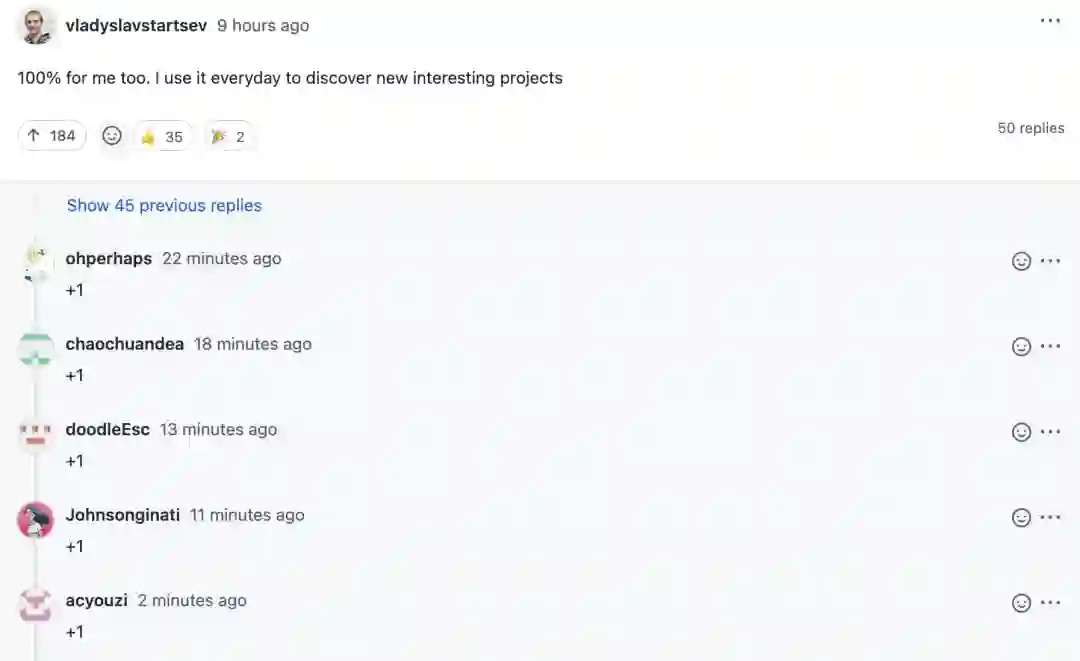 有近 400 位的开发者持赞同态度,“对我来说也是 100%。我每天都用它来发现新的有趣的项目”。