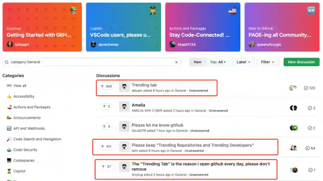 此举也让通过 Trending 热榜查看每天、每周、每月比较活跃且有趣的项目库、了解一线开发者的使用者们感到不满,其纷纷涌进 GitHub 社区讨论板块,前五条中便有三条是关于 GitHub Trending 的讨论。