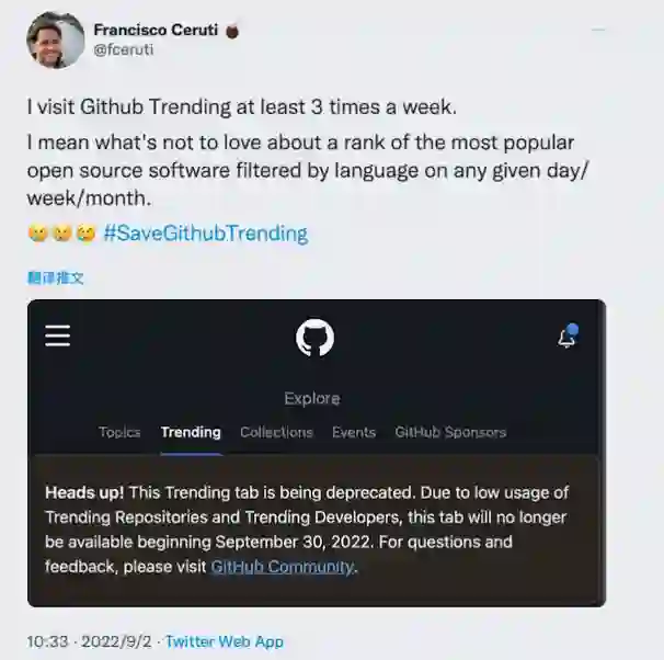 注意了! 这个 "Trending "标签已被废弃。由于 Trending 页面上"Repositories"和 "Developers "的使用率较低,从 2022 年 9 月 30 日起,该标签将不再可用。如有问题和反馈,请访问 GitHub 社区。