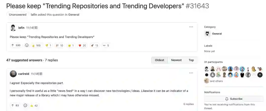 与此同时,开发者还发起了「Please keep "Trending Repositories and Trending Developers" 」的请愿。不过目前看起来,似乎并不会左右 GitHub 官方最终的决定。