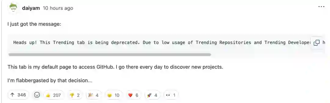 一位开发者在讨论区留言称,“这个功能是我访问 GitHub 的默认页面。我每天都会去那里发现新的项目。我对这个决定感到吃惊...”。