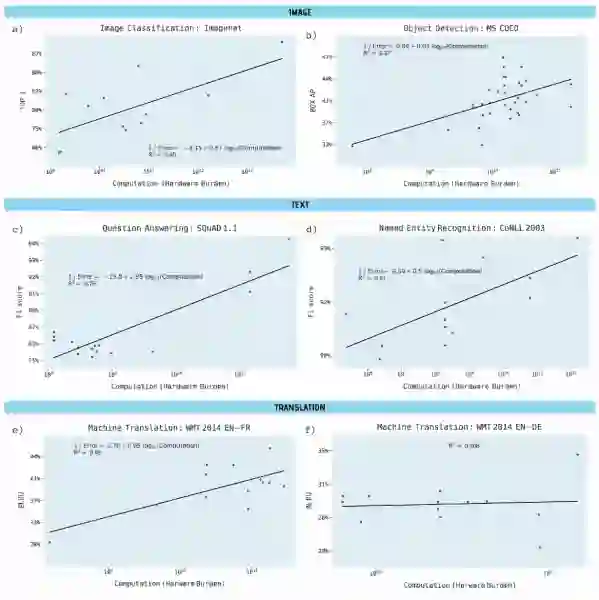 对象检测,命名实体识别和机器翻译对于硬件的负担大幅增加,而结果的改善却相对较小,计算能力解释了流行的开源ImageNet基准测试中图像分类精度差异的43%。