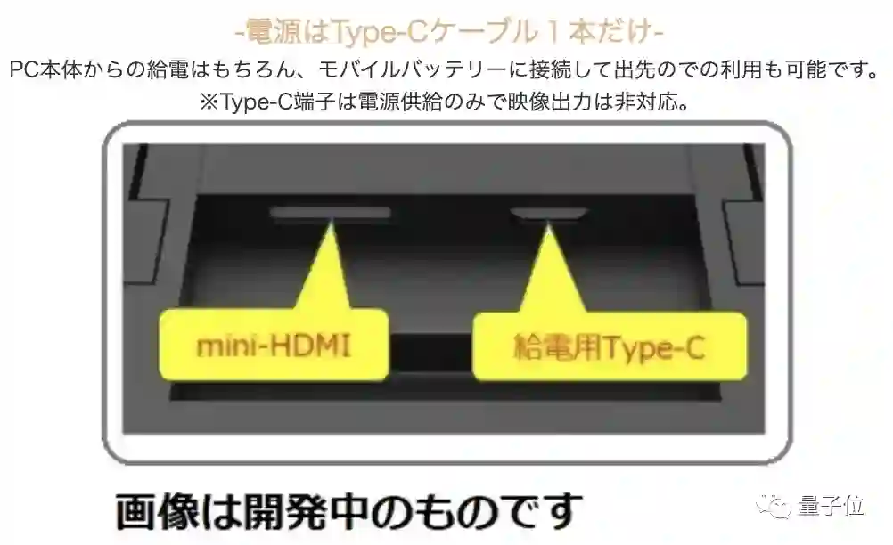 配有一个USB Type-C接口但是只作供电用,信号传输用的是mini-HDMI接口,总之是要插两根线才行。