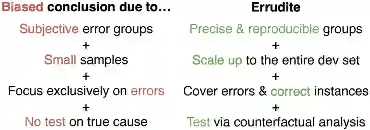 这还没完,样本数量小才仅仅是常见做法中出现的第一个问题而已。在 ACL 2019 论文《Errudite: Scalable, Reproducible, and Testable Error Analysis》中,作者们详细列举了 NLP 误差分析中的许多个关键挑战,也提出了三个原则,希望大家能够把误差分析做得更准确,也具备更的可重复、可拓展、可测试(论文:http://idl.cs.washington.edu/files/2019-Errudite-ACL.pdf)。作者们还设计了 Errudite,这是一个实践了这些原则的交互式工具,它也可以逐个应对发现的问题。