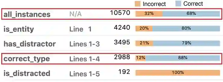 现在我们已经建立起关于干扰词的分组了。但是,出现错误的时候同时有一个干扰词并不一定代表干扰词是这个错误出现的根本原因。回到前面的例子,我们可以简单地认为出错的根本原因是因为有干扰词,但也可能是因为我们需要做多句推理,需要把「神秘博士」和「系列」联系起来,又或者还有别的原因。