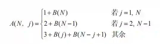 如果N值较大,就要用公式来简化计算。假设你(t=1)选择了最后位置,第二人(t=2)则会选择第一位置,第三人(t=3)要在两端已被占的情况下选择一个位置。记B(N)为两端已被占时饱和所需人数,于是有A(N, N) = 2+B(N),对称地有,A(N, 1)=2+B(N)。
