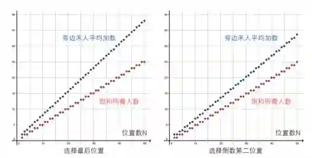 厕所饱和之后,新来的人随机选择。如果你选了两端的位置,旁边来人的平均加数[2]为(N+2)/4(其中N为偶数),或者(N+1)/4(其中N为奇数)。