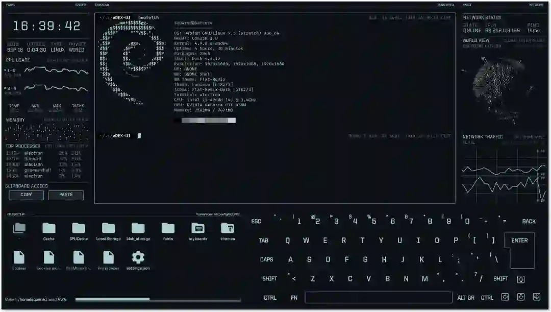 eDEX-UI 是一个类似于科幻电脑界面的全屏桌面应用程序,深受DEX-UI和TRON Legacy电影效果的启发。 它在真实终端中运行您选择的shell,并显示有关系统的实时信息。 它被用于大型触摸屏,但可以在普通台式电脑或平板电脑或其中一款带触摸屏的时髦360°笔记本电脑上使用。