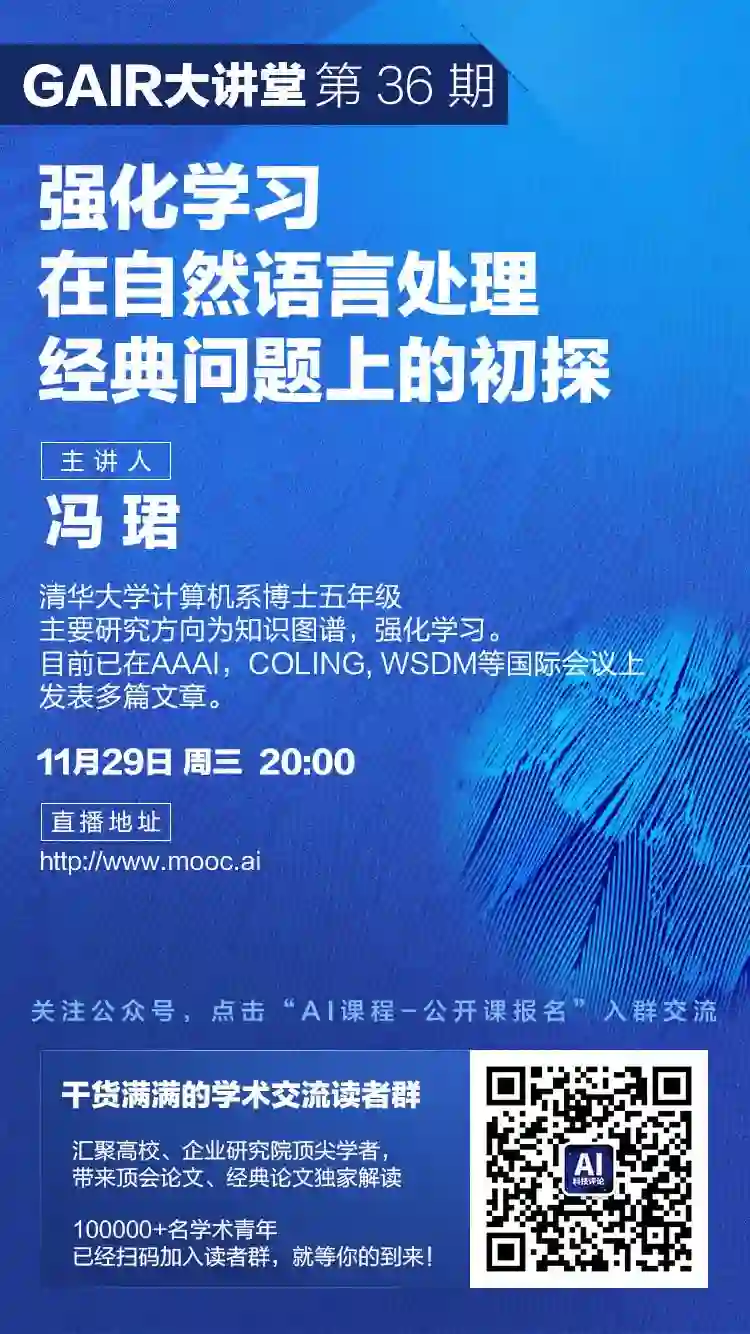 冯珺,清华大学计算机系博士五年级,师从朱小燕和黄民烈教授,主要研究方向为知识图谱,强化学习。目前已在AAAI,COLING, WSDM等国际会议上发表多篇文章。
