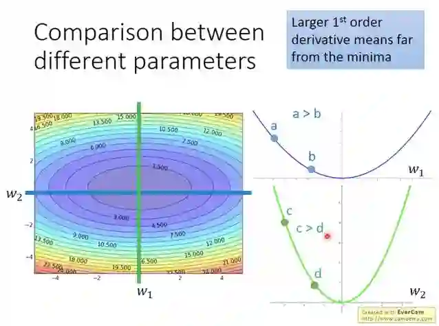「梯度下降」课程中的 PPT 。对比了不同梯度下曲线的形状。