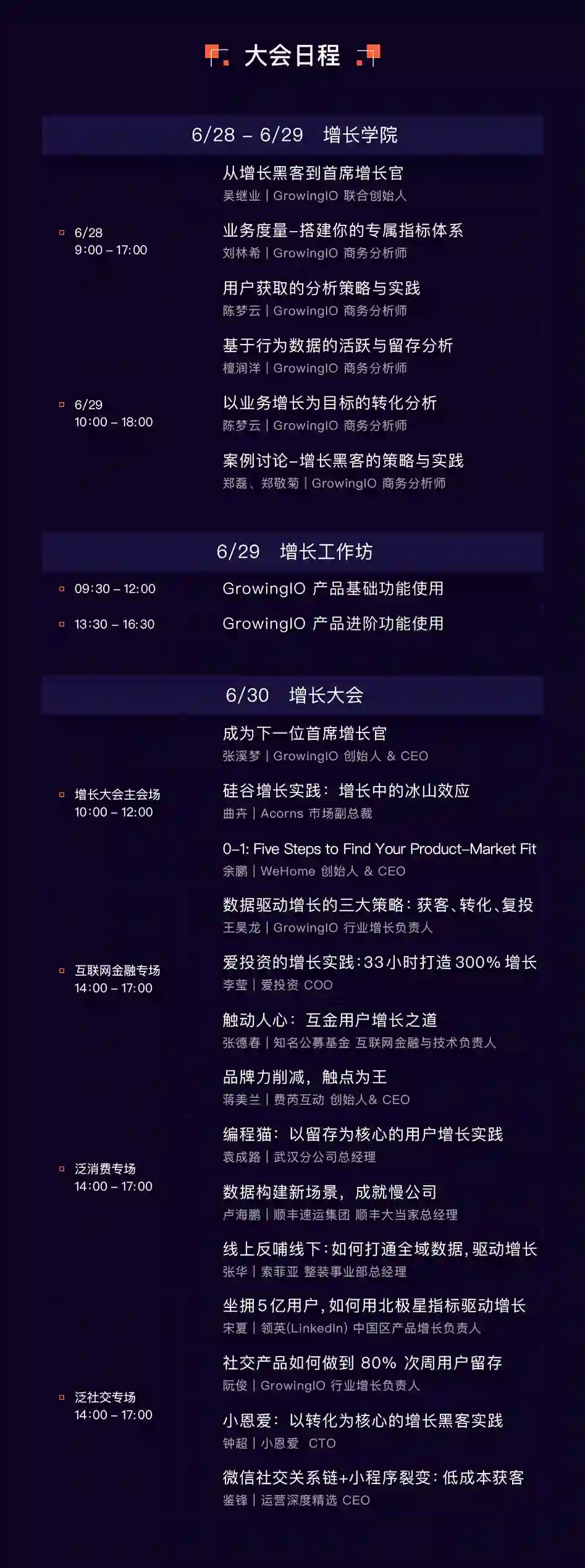 2018 深圳站,邀请 GrowingIO 创始人 & 《首席增长官》作者张溪梦、《硅谷增长黑客实战笔记》作者 & Acorns 市场副总裁曲卉、原 Airbnb 中国区产品与增长负责人 & WeHome CEO 余鹏等国内外增长大佬的增长经验,揭晓增长背后的运转体系、提高用户转化和活跃的制胜方法。