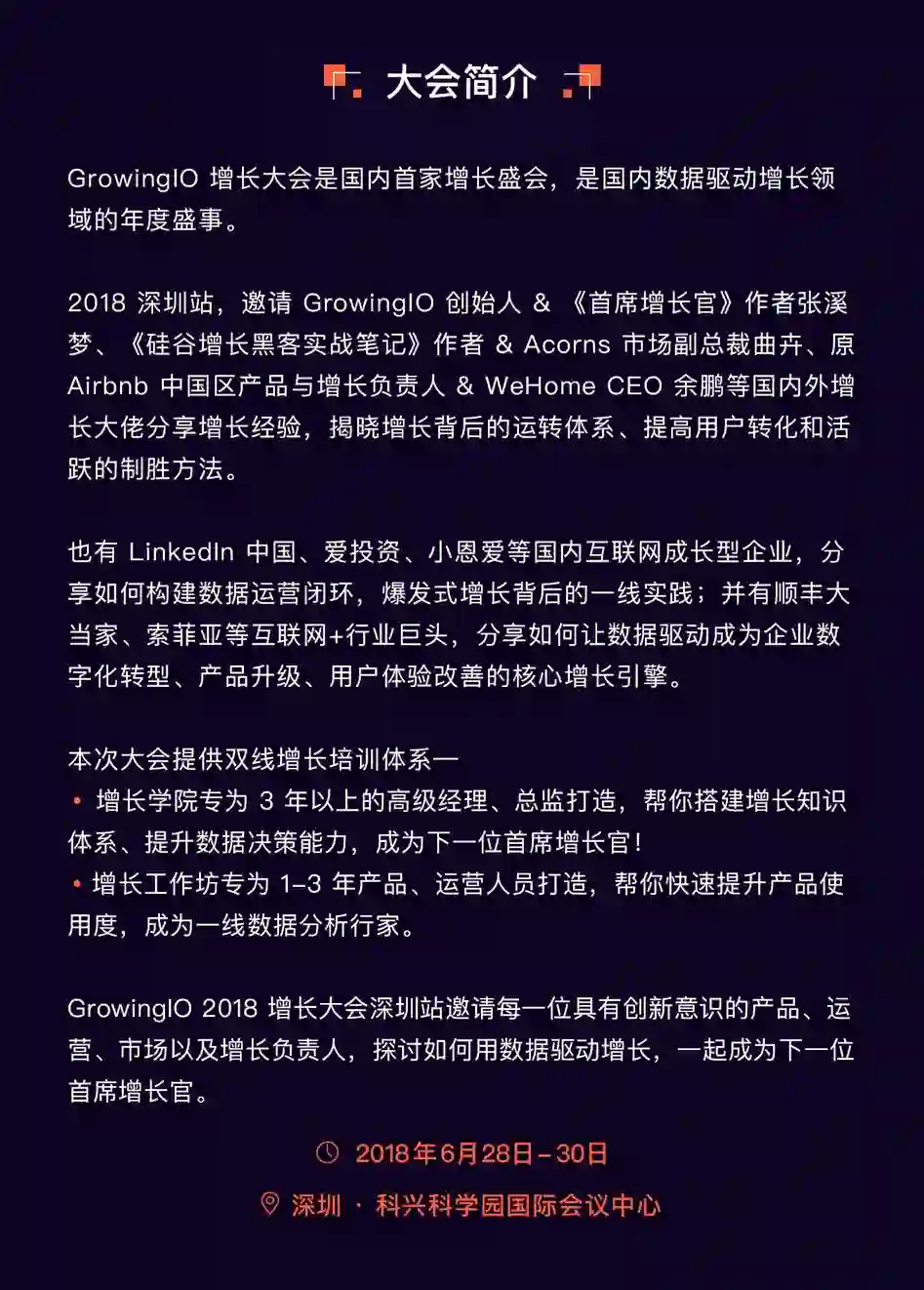 GrowingIO 2018 增长大会深圳站邀请每一位具有创新意识的产品、运营、市场以及增长负责人,探讨如何用数据驱动增长,一起成为下一位首席增长官。
