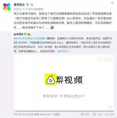 董明珠的这番言论立即引发行业热议,“春雨医生”在官方微博转发该新闻并评论道:“我认为是有可能的,就是这个锅可以根据患者的类型自动生成二甲双胍或胰岛素(格力可能还为此专门研发了口服胰岛素)加入到饭中,并且通过一系列复杂的反应把米饭中的碳水化合物变成膳食纤维,配合上面说的降糖药,可以实现敞开吃……我实在编不下去了……”