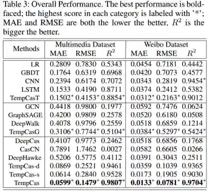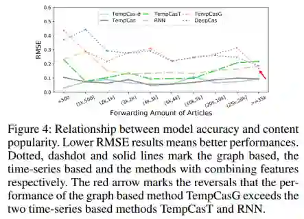 研究者将多个方案的 RMSE 预测结果与相应的最终转发量相关上,并绘制了 Figure 4。可以看到,当面对热点内容时,基于级联图嵌入的方法往往比基于时间序列的方法具有更好的性能。