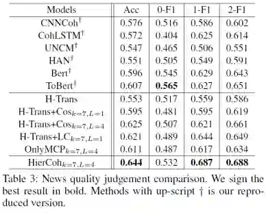 此外,微信搜索数据质量团队采集了微信平台上的新闻文章,并将描述同一个主题或事件的新闻组成新闻对,雇佣标注人员标注了这两篇新闻的质量哪个更好。共分为 3 个类别,类别 0 表示两篇新闻质量相近,类别 1 表示第一篇新闻质量更好,类别 2 表示第二篇新闻质量更好。研究者用孪生网络结构来建模两篇文章,然后合并最终的文章表示向量到 softmax 输出层,得到三分类概率,并用交叉熵作为损失函数来训练模型。实验结果如下,HierCoh 模型取得了最优的效果。