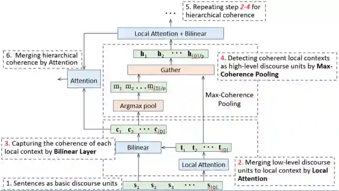 HierCoh 中最重要的部分是层次连贯性建模部分。该部分首先提取每个句子的局部上下文(local context block) 语义,然后得到句子跟该上下文的多维连贯性表示向量。研究者将句子视为最低级(low-level)的语义单元,然后基于这样一个假设得到高级 (high-level) 语义单元:如果连续的几个低级语义单元具有高连贯性,那么他们可以被视为一个高级语义单元。然后用同样的方式得到高级语义单元的连贯性,以及更高级的语义单元和他们的连贯性。研究者用 Local Attention 来提取局部上下文,用双线性层来建模多维连贯性,并提出了 Max-coherence Pooling 来提取高级语义单元。