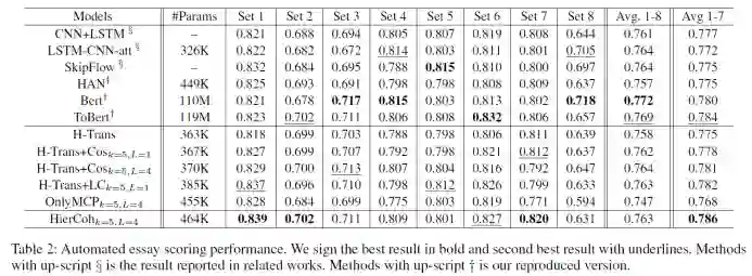 在自动作文打分任务上的结果如下表,可以看出 HierCoh 模型在作文题目 1-7 的集合上都取得了最优 / 较优的效果(作文集合 8 由于文章数量最少并且文章长度最长)。