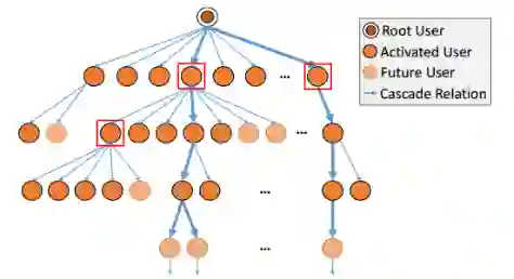 传播量是衡量在线文章受欢迎程度的最重要指标之一。在线文章的传播量是指用户通过社交媒体转发在线文章的次数。在社交媒体中,用户与他们的朋友共享并交换有趣的文章内容。因此,在线内容的传播通常从作者开始,并通过社交网络传播,从而形成级联图。级联图通常是有向无环图。其中有向路径表示通过社交网络的内容传播过程。社交网络上的信息传播形成为社交网络强化模型和以社交中心为枢纽的模式。级联图的尺寸(节点数量)可被视为在线内容的转发量。因此可以通过对级联图建模,从而得到能准确预测传播量的模型。