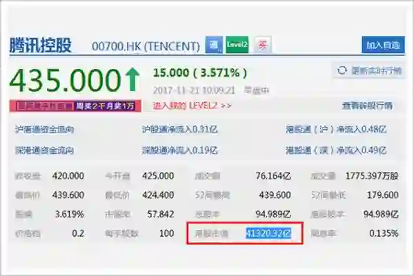 一系列超常规的资本运作,推动着腾讯股价一路走高,2017年11月21日达到历史最高点,逼近440港元,市值超过4万亿,约合5288 亿美元,居苹果、谷歌、微软、亚马逊之后,成为全球市值第五大公司。