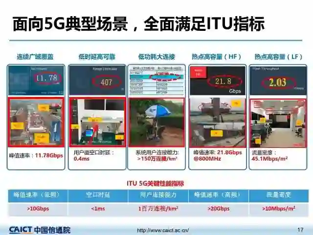目前测试的结果表明,峰值速率大于10G,实测11.78G,高频达到21.8G,空口时延小于1毫秒,实测0.4毫秒,每平方公里连接超过150万个,流量密度达到45.1Mbps/m2基本上可以很好地满足ITU的指标要求。