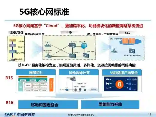 ▷ 架构方面,进一步向扁平化发展,过去2G、3G的四层,到4G已经变成三层,到5G可能更加简洁,变成两层,而且很多地区还有移动边缘计算。3GPPR15核心网标准重点落实像网络切片,移动边缘计算和确保端到端用户的安全。