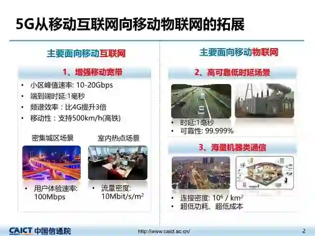 ITU-R已于2015年6月定义了未来5G的三大类应用场景,分别是增强型移动互联网业务eMBB(Enhanced Mobile Broadband)、海量连接的物联网业务mMTC(Massive Machine Type Communication)和超高可靠性与超低时延业务uRLLC(Ultra Reliable & Low Latency Communication),并从吞吐率、时延、连接密度和频谱效率提升等8个维度定义了对5G网络的能力要求。
