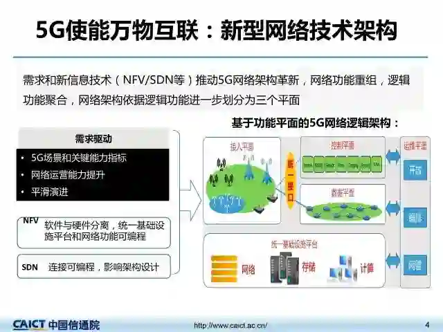 ▷ 核心网方面,5G应该说很好地采用了NFV和SDN的一些理念,大部分是基于软件和硬件分离的NFV的架构,不再像我们过去4G是独立的,是完全分离的单元,而是基于功能平面的5G网络的架构。在大家看起来都是服务器,在上面虚拟出很多不同的功能单元,从网络功能设计来看,也更好地实现了控制和数据平面的分离。