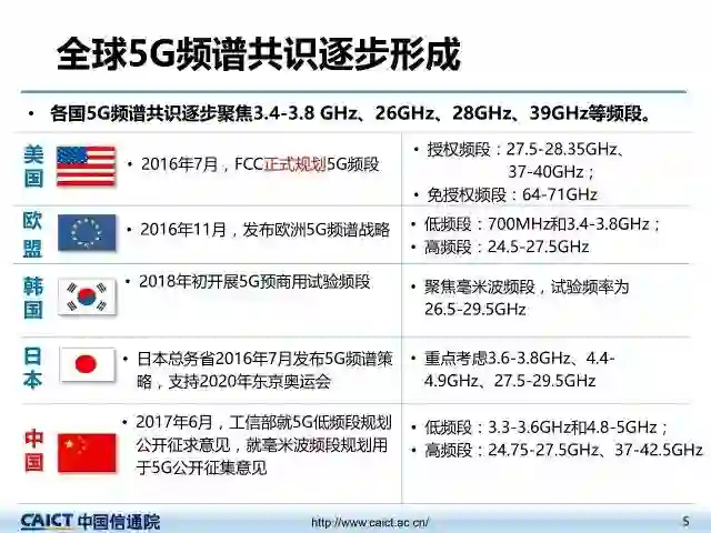 ▷ 频谱方面,王志勤表示:“目前只有美国2016年7月份正式规划了5G的频谱,主要集中在高频。欧洲发布了5G的频谱战略,日本和韩国只是进行的5G商业试验和为奥运会发布了一些试验频段。国内在5G频谱进展较快,今年6月针对5G 6GHz以下低频发布了一个规划征求意见稿,另外还发布了比较倾向性的毫米波频率征求意见。