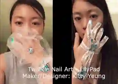 除了墨镜,Kitty 甚至连女孩子的指甲都考虑到了:她最近开发出来的样品是一个可以闪的手指甲,每个指甲连着蕾丝,蕾丝连着正极和负极的导电线,把一个小的 LED 灯放在指甲贴片后面时,灯就会闪个不停: