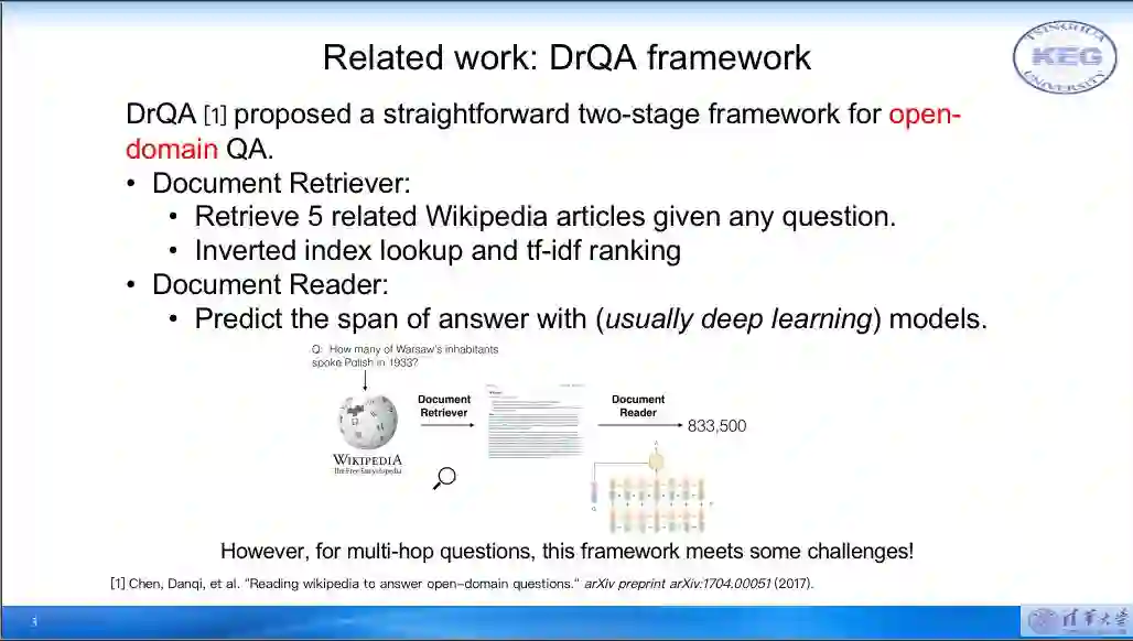 对于大规模开放领域阅读理解问题,传统的框架往往基于信息检索与端到端的黑盒阅读理解模型。在复杂多跳问题上,仍然被短视检索、缺乏解释性等问题困扰。本次报告主要介绍了基于认知科学中的双过程理论,将人的思索过程连成认知图谱,并通过预训练语言模型与图神经网络解决以上问题。