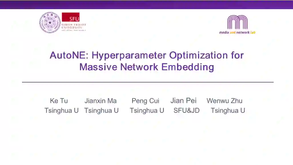 为了保持网络中各种各样的性质,网络表征学习通常含有大量的超参数。这些超参数通常需要严格的设置以达到良好的效果。大规模网络数据给网络嵌入的超参数优化带来了巨大的挑战。我们提出了一个新的框架AutoNE,来自动的优化网络嵌入算法中的超参数。具体地,我们利用了一个多源随机游走来采样多个子网络,设计一个元学习器来从子网络传递关于超参数的知识到原始的大图。传递过来的元知识能极大的减少搜索最优超参数的次数。大量的实验表明我们的框架能显著的优于现有的方法。