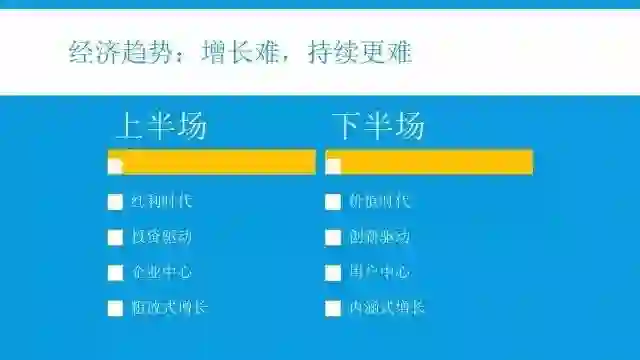 对我国的企业来说,还要面临另外一个严峻的现实——经济下行。关于经济走势,一直有V型、U型和L型的争论,说的是经济回升的时间问题。但几乎所有人都认为,在经历了三十多年的快速增长后,经济已进入下半场。经济增长的转场至少表现在四个方面:政策、人口红利结束,价值创造时代开启;由投资驱动转向创新驱动;企业中心的增长转向用户中心;粗放式增长方式转向内涵式增长。