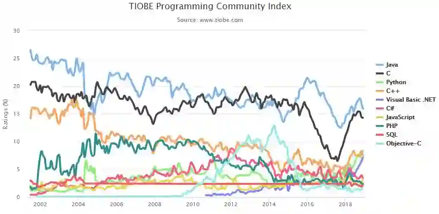 TOP 10 编程语言 TIOBE 指数走势(2002-2018)