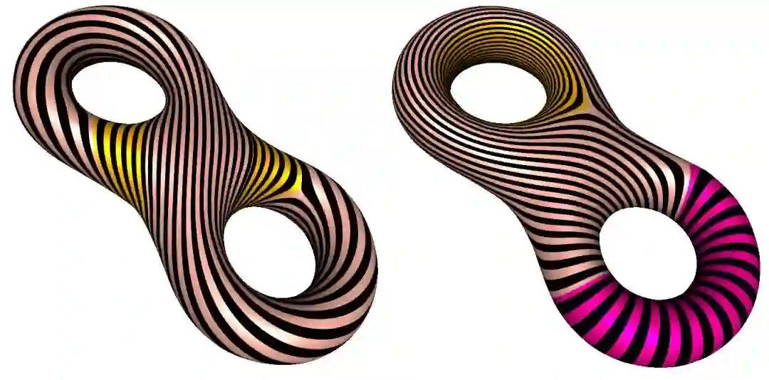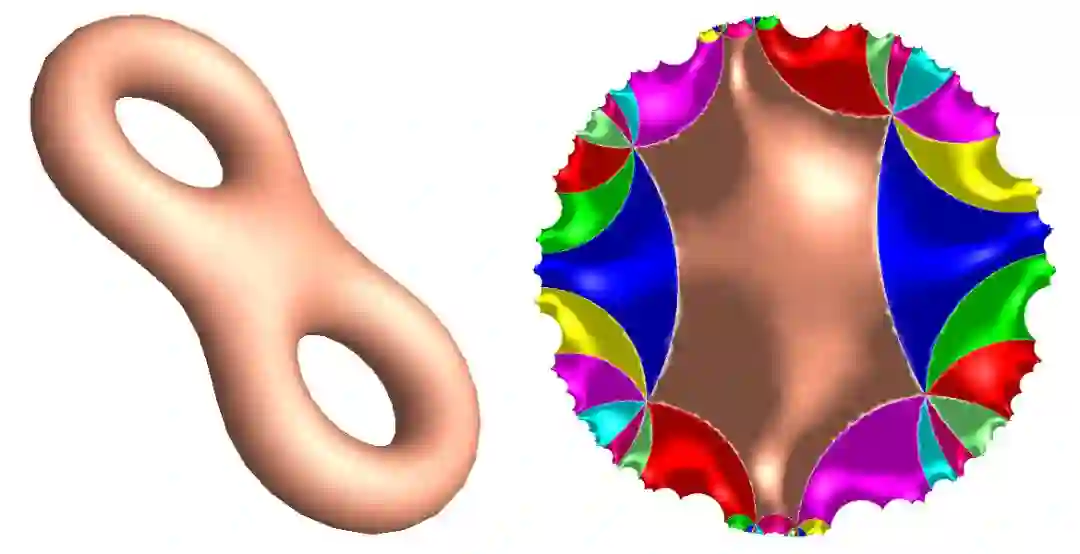 哈迪德为之终生迷恋的叶状结构(foliation)在拓扑和微分几何中起到了至关重要的作用。1980年代,低维拓扑领域发生了天翻地覆的变化,这场革命的领导者Thurston和Sullivan就是应用foliation洞察了三维流形的结构,很多突破就是在highline下的曼哈顿发生。如图7所示,每个高亏格曲面都可以配备双曲度量。固定一个拓扑曲面,其上所有可能的双曲度量构成了Teichmuller空间。