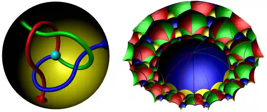 我们再来考察三维流形。如图9所示,假设三条蛀虫在苹果中打穿了三条彼此缠绕的隧道,如此得到的流形容许一个双曲度量,使得边界表面成为双曲曲面,其覆盖空间在三维双曲空间中的等距嵌入显示在右帧。任意一个三维流形,如果容许双曲度量,被称为是双曲三流形。