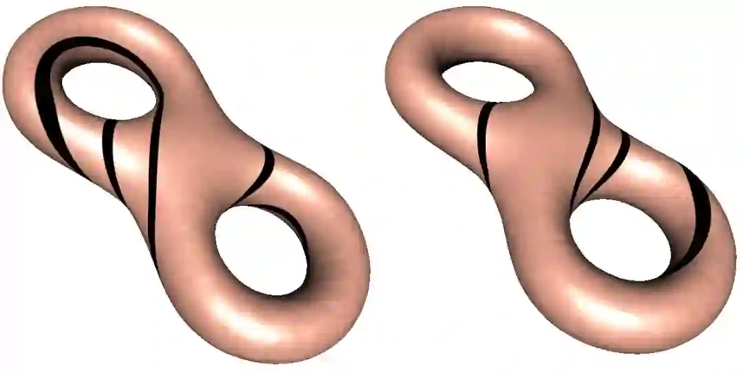 可测叶状结构的测度几何意义如下。如图8所示,曲面上的所有简单闭曲线的同伦类构成了曲线空间。曲面上任意一条简单闭曲线会穿越叶状结构的一些叶子(或称纤维),这些叶子的条数定义了叶状结构的测度。可以看出,当我们将简单闭曲线进行同伦变换时,相交叶子的代数条数没有变化,因此一个可测叶状结构定义了曲线空间上的一个函数。