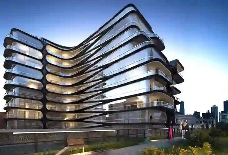 行走在highline上,不经意间,迎面一幢现代建筑,雍容典雅,柔顺流畅。弧形的落地长窗包络出大厦的轮廓,楼层之间勾勒着优美的曲线。老顾一眼望去,立刻猜到这必是出自国际建筑设计大师扎哈·哈迪德之手,因为这个建筑的最大特色就是曲面的叶状结构(foliation),而叶状结构正是哈迪德的核心品牌。