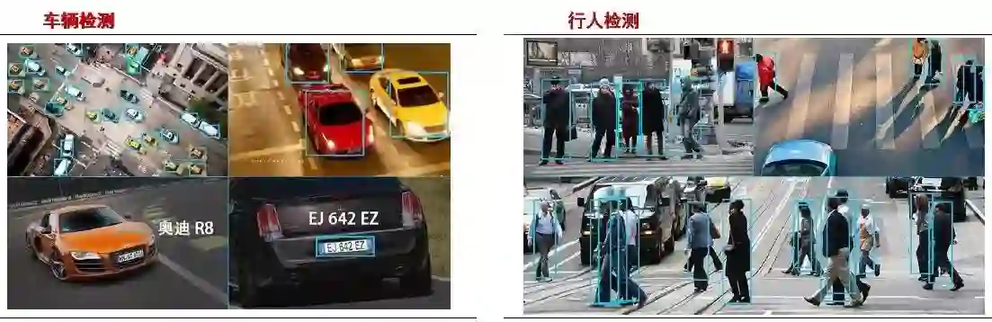 2)识别行人车辆。基于深度学习的行人检测算法能够在各类遮挡的情况下精确找出行人位臵,并能够进一步分析行人姿态和动作,可应用于交通监控、辅助驾驶、无人驾驶等。可以在行车场景、交通监控场景、卡口场景中检测多种不同角度的车辆,并同时给出车牌号码、汽车品牌、型号、颜色等物理特征。