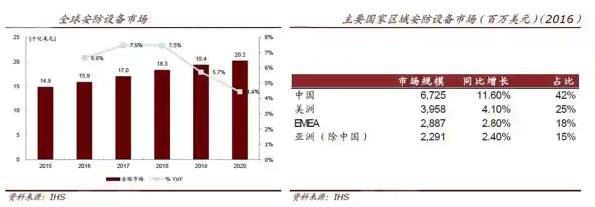 根据IHS 统计,2016 年全球安防设备市场规模达到158.6 亿美元,同比增长6.6%。其中中国市场最大,市场规模67.25 亿美元,同比增长11.6%,占全球42%。美洲市场第二,市场规模39.6 亿美元,同比增长4.1%,占全球25%。