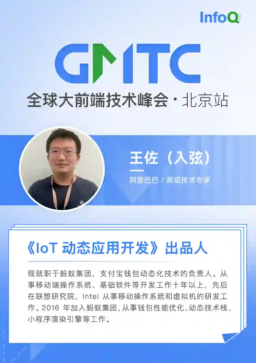 目前国内 IoT 设备应用场景还处于碎片化状态,为了促进 IoT 动态应用能力的进一步发展,即将举办的 GMTC 全球大前端技术大会(北京站)上,我们策划了「 IoT 动态应用开发」专题,邀请了蚂蚁集团高级技术专家王佐(入弦)担任出品人,已确定《优酷 OTT 小程序应用实践》和《美的 IoT 跨平台开发框架方案与实现》两个议题,更多精彩内容正在打磨上线中。