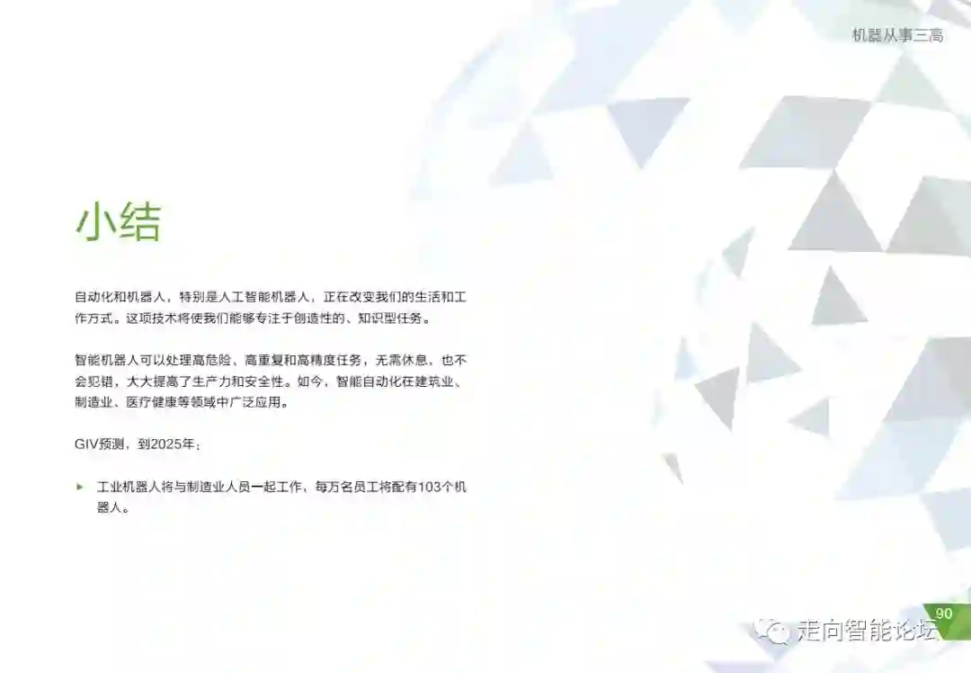 自动化和机器人,特别是人工智能机器人,正在改变我们的生活和工作方式,他们可以从事处理高危险、高重复性和高精度的工作,无需休息,也不会犯错,将极大提高生产力和安全性。如今,智能自动化在建筑业、制造业、医疗健康等领域中广泛应用。