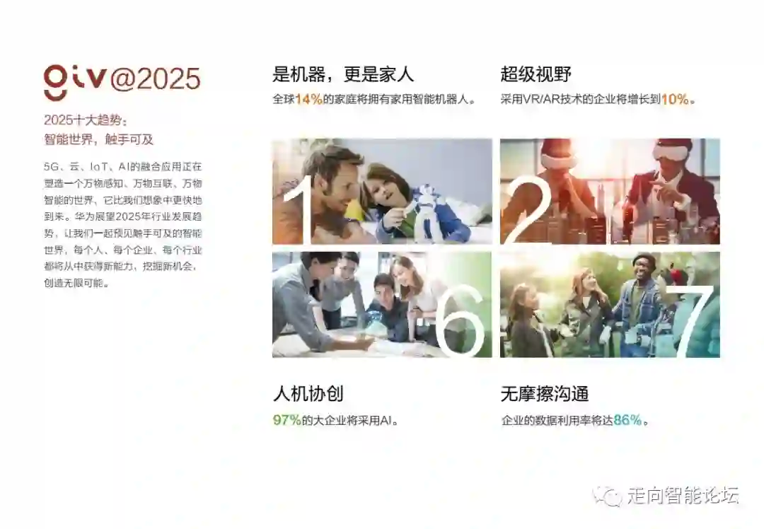 华为今日发布全球产业展望GIV@2025,基于对交通、零售、金融、制造、航空等17个重点行业的案例研究,提出智能世界正在加速而来,触手可及,并预测:到2025年,智能技术将渗透到每个人、每个家庭、每个组织,全球58%的人口将能享有5G网络,14%的家庭拥有“机器人管家”,97%的大企业采用AI。文末附166页报告全文PDF下载。本文综合来自:华为,报告版权归华为所有,由《走向智能论坛》公号小智整理。