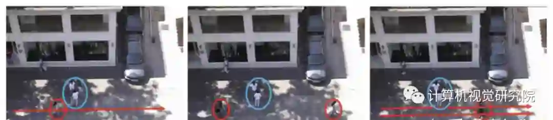 有一篇论文主要研究动态物体间的交互建模。出发点是当前的很多建模方案例如pooling和attention,都是基于目标之间的欧式距离来判断交互关系的强弱,但我们认为这种基于欧氏距离的判断方法,不能很好的处理现实生活中复杂的情况。比如下图的三组行人,红色两组虽然距离较远,但是表现出了跟随的行为,而红蓝两组虽然距离较近,但是没有产生很强的相互作用。