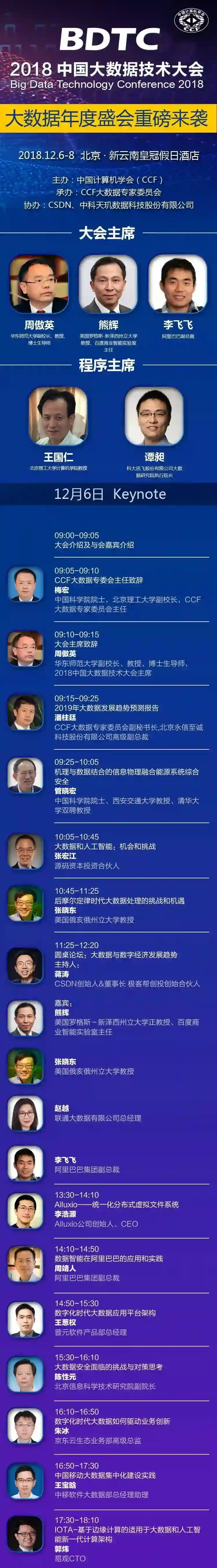 本次大会由华东师范大学副校长、教授周傲英,百度商业智能实验室主任熊辉,阿里巴巴副总裁李飞飞三位会议主席对大会内容把关,多位两院院士参与指导,由最了解行业痛点的一线从业者为同行打造,国内、国际、应用、学术,技术前沿、最佳实践尽在其中——烹茶煮酒,静待君至,大会组委会在此特别奉上独家参会指南,期待与您共享年度大数据技术盛宴。