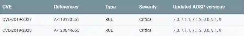 其中,存在最高等级风险的是位于媒体框架(media framwork)中的一个严重安全漏洞,它可以使攻击者传送更改后的文件,从而在拥有权限的情况下远程执行任意代码。CVE-2019-2027 和 CVE-2019-2028 都包含在这一媒体框架内。