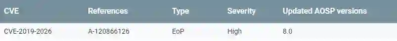 CVE-2019-2026 所在的 Android 框架中的部分漏洞可以使本地攻击者通过用户交互获得额外权限。其余几项位于运行系统中,其中严重的漏洞可能会使本地恶意应用程序取得权限,执行任意代码。
