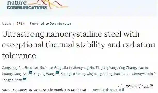 近日,燕山大学亚稳材料制备技术与科学国家重点实验室清洁纳米能源中心沈同德教授团队与国内外科学家合作,针对奥氏体钢强度偏低、辐照后易肿胀以及纳米晶金属高温下晶粒易长大等问题,创新性的通过界面元素偏聚及纳米析出钉扎,制备出超强且具有优异的热与辐照稳定性的块体304L纳米晶奥氏体钢,相关研究成果于2018年12月19日在线发表于Nature Communications。